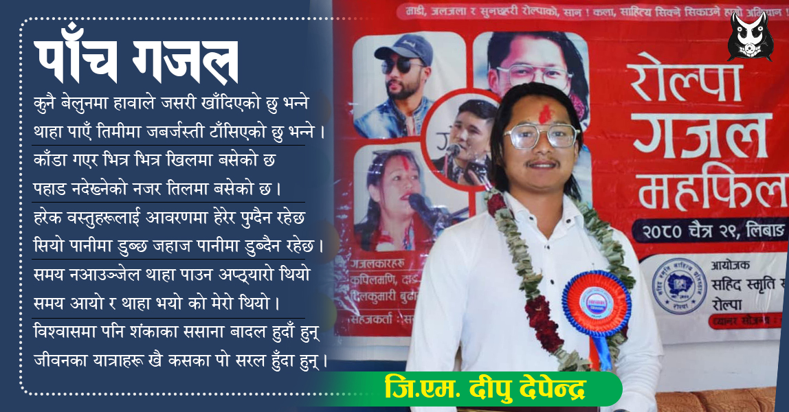 रुकुमका जि.एम. दीपु देपेन्द्रले यी गजलहरू ‘सहिदस्मृति साहित्य प्रतिष्ठान¸ रोल्पा’ले २०८० चैत्र २९ गते लिबाङमा आयोजना गरेको ‘रोल्पा गजल महफिल–२’मा वाचन गर्नुभएको थियो ।