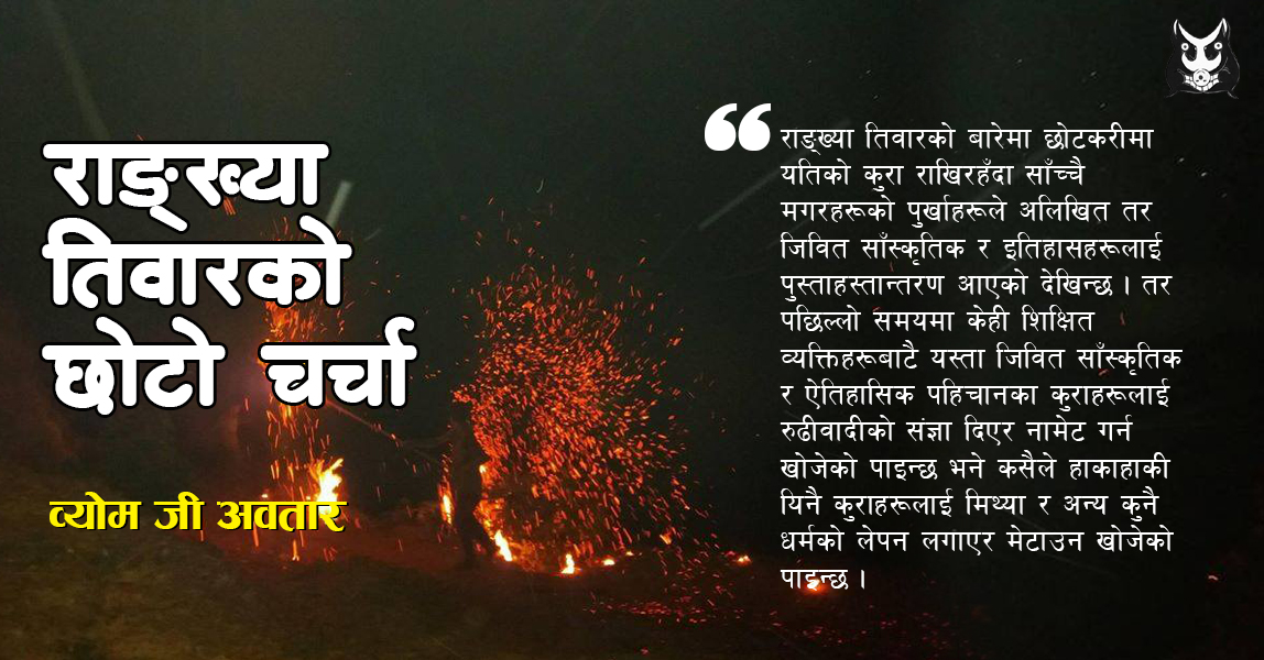 राङ्ख्या तिवारको बारेमा छोटकरीमा यतिको कुरा राखिरहँदा साँच्चै मगरहरूको पुर्खाहरूले अलिखित तर जिवित साँस्कृतिक र इतिहासहरूलाई पुस्ताहस्तान्तरण आएको देखिन्छ । तर पछिल्लो समयमा केही शिक्षित व्यक्तिहरूबाटै यस्ता जिवित साँस्कृतिक र ऐतिहासिक पहिचानका कुराहरूलाई रुढीवादीको संज्ञा दिएर नामेट गर्न खोजेको पाइन्छ भने कसैले हाकाहाकी यिनै कुराहरूलाई मिथ्या र अन्य कुनै धर्मको लेपन लगाएर मेटाउन खोजेको पाइन्छ । त्यसै त दशवर्षे जनयुद्धको समयमा माओवादीहरूबाट हामी पुरानो संस्कृति ध्वंसकारी र नयाँ जनवादी संस्कृतिको निर्माणकारी भनेर जानाजान हाम्रो यस्त किसिमको जिवित संस्कार संस्कृतिहरू माथि खेलबाड गरियो र झन् पछाडि पारियो । भने पछिल्लो समयमा सामाजिक सञ्जालहरूले गर्दा अगाडि आउन खोजिएको लोपोन्मुख हाम्रो संस्कार संस्कृतिहरूलाई कोही कोही (विज्ञ तथा प्राज्ञिक वर्ग) बाटै अझै पछाडि पार्न खोजिएको त होइन भन्न भान हुन्छ । तर यस्ता कुराहरूको हामी शिक्षित युवा पुस्ताले डटेर सामना गर्न सक्नु पर्दछ । हाम्रो अलिखित सांस्कृतिक र ऐतिहासिक कुराहरूलाई दस्तावेजीकरण गर्न अगाडि बढनु पर्दछ ।