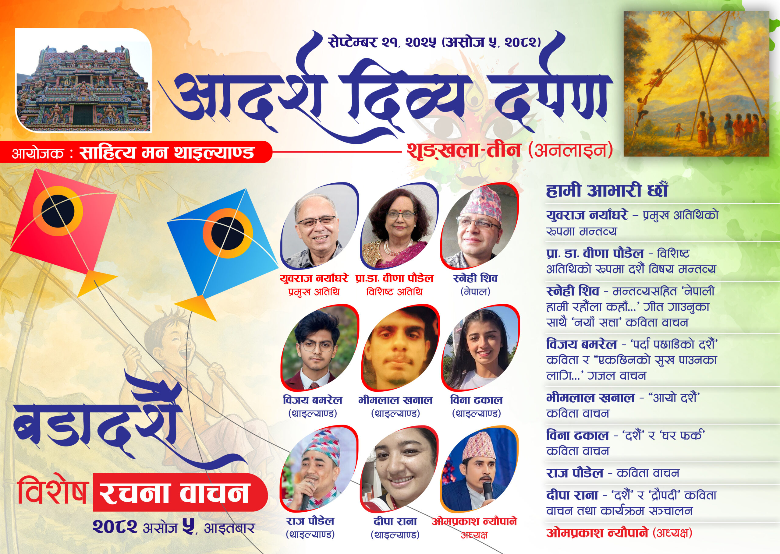 सेप्टम्बर २२¸ थाइल्याण्ड । साहित्य मन थाइल्याण्डले आइतबार ‘दशैँ : विशेष रचना वाचन’ कार्यक्रम सम्पन्न गरेको छ । साहित्य मन थाइल्याण्डले सञ्चालन गर्दै आइरहेको ‘आदर्श दिव्य दर्पण’ को तेस्रो शृङ्खलामा उक्त कार्यक्रम सम्पन्न भएको हो ।
