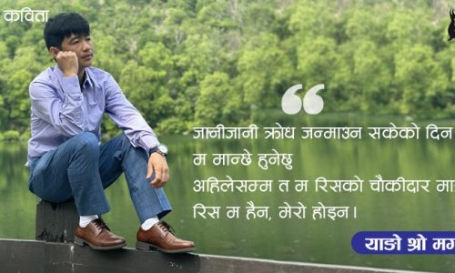 म मान्छे याङो श्रो मगर ५ आश्विन २०८०, शुक्रबार रिस आउँछ जान्छम पछुताउँछु,धिक्कार्छुसजाय हुन्छगाली झम्टिन्छ । जानीजानी अझसम्म कसैमाथि रिसाएको छैनजानीजानी