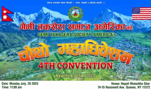 गेमी ताकसेरा समाज अमेरिकाको चौथो अधिवेशन न्यूयोर्कमा भव्य रूपमा सम्पन्न, मधुकर बुढा मगर पुनः अध्यक्ष चयन युवराज घर्ती मगर १४ श्रावण २०८२, मंगलवार न्यूयोर्क, जुलाई २८ — गेमी तकसेरा समाज अमेरिकाको चौथो अधिवेशन यही सोमवार