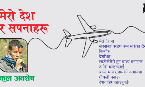 कविता : मेरो देश र सपनाहरू कूल अवशेष २२ फाल्गुन २०८०, मंगलवार सपनाहरू उम्रेर हराभरा हुँदैनन्मेरो देशको माटोमाबर्षेनी सयौँ ट्रिपदेशभित्र कामकाज नपाएरजान्छ बादलको जहाज