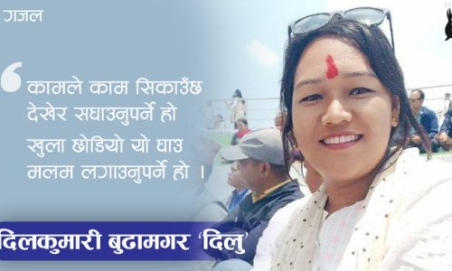 गजल : दिलकुमारी बुढामगर ‘दिलु’ दिलकुमारी बुढामगर ‘दिलु’ १० कार्तिक २०८०, शुक्रबार कामले काम सिकाउँछ देखेर सघाउनुपर्ने होखुला छोडियो यो घाउ मलम लगाउनुपर्ने हो